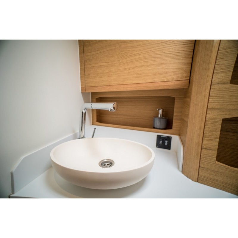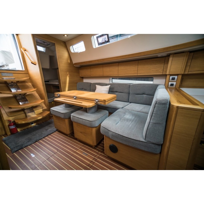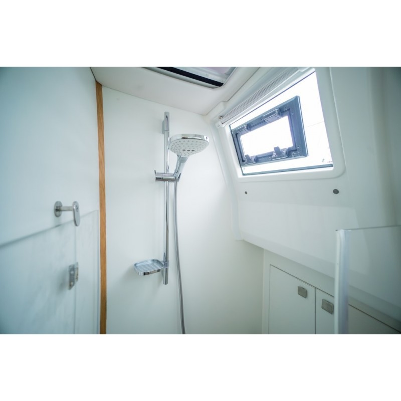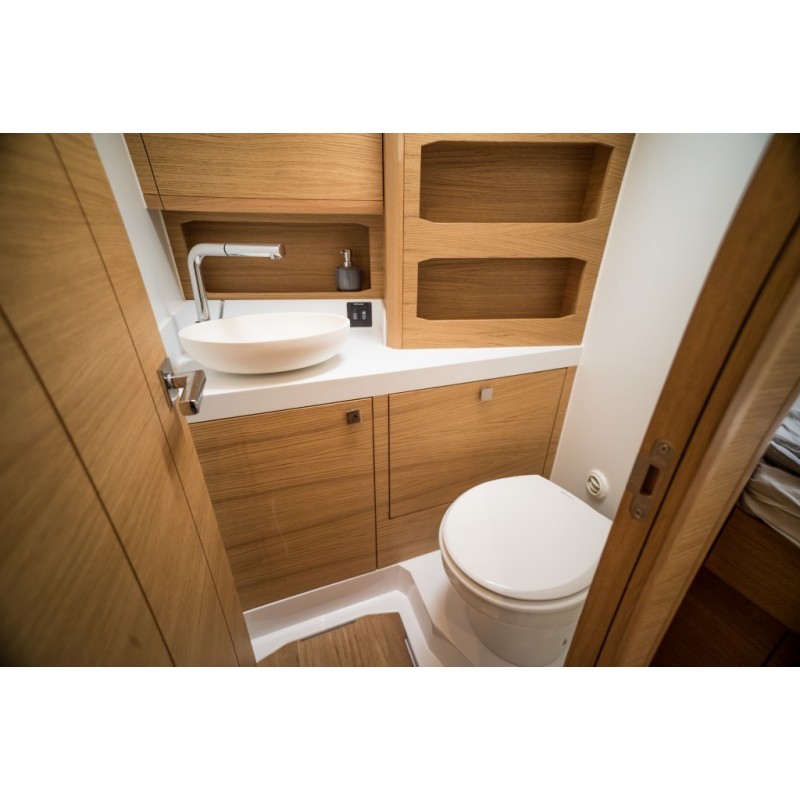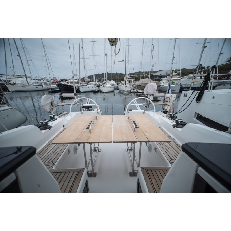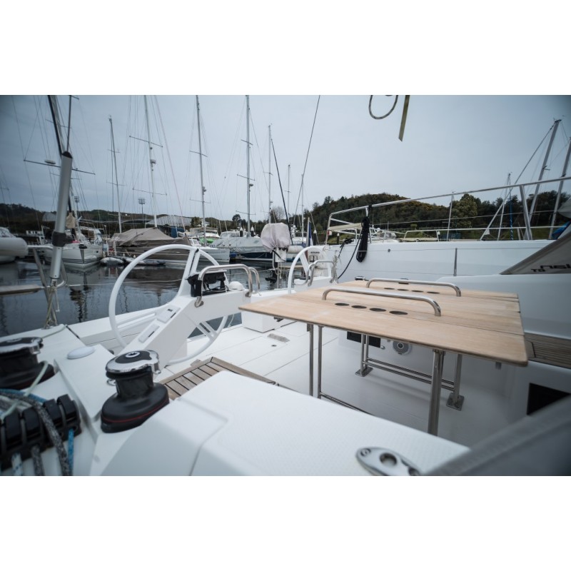 El barco cuenta con calefacción por aire en camarotes y salón principal, baños eléctricos, equipo de sonido Fusion en salón y cockpit, instrumental muy completo, velas OneSails de última generación con mayor full batten y foque enrollable con sables verticales. Además cuenta con parrilla a gas Magma y un completo equipo de ropa de cama, toallas, etc. En el exterior, cel generoso cockpit puede acomodar hasta 8 personas, protegidas con chubasquera y cockpit-tent con cierres laterales.