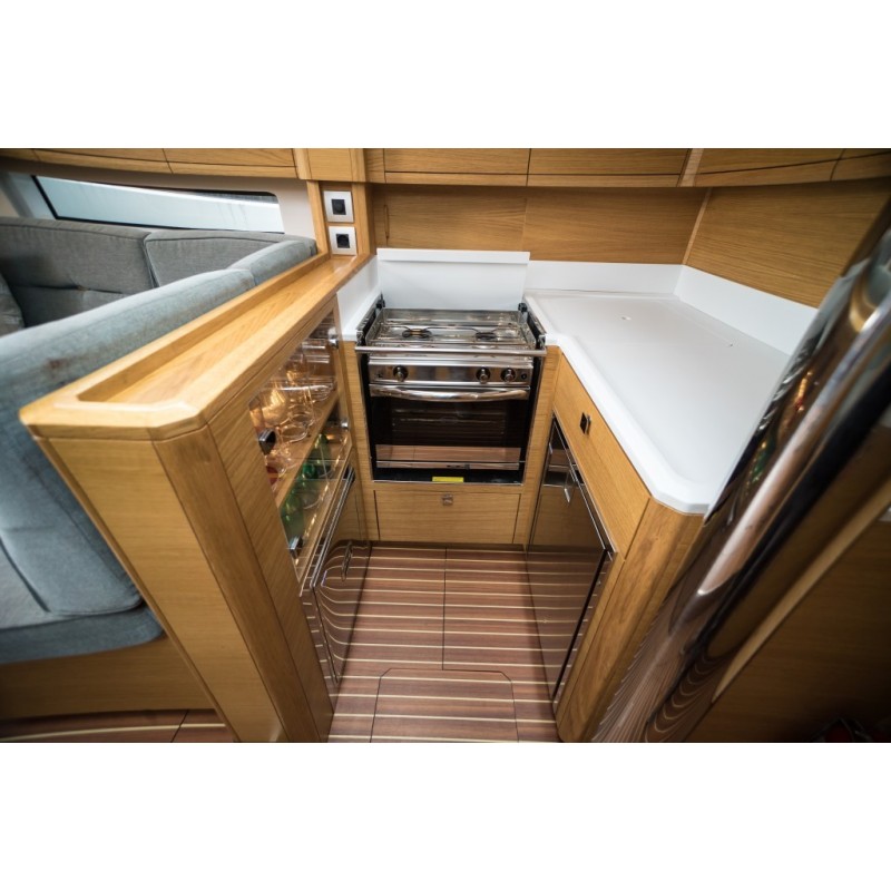 Además cuenta con una cocina en proa con equipo de frío y freezer por separados, de manera de conservar una buena cantidad de alimentos.